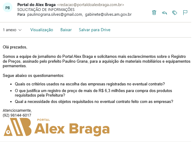 A equipe de jornalismo do Portal Alex Braga tentou contato com a Prefeitura de Silves e o gabinete da prefeito Paulino Grana, para pedir mais esclarecimentos sobre o Registro de Preços assinado com as empresas. Contudo, até o fechamento desta matéria não obtivemos resposta por parte da Prefeitura. O espaço segue aberto para mais esclarecimentos.