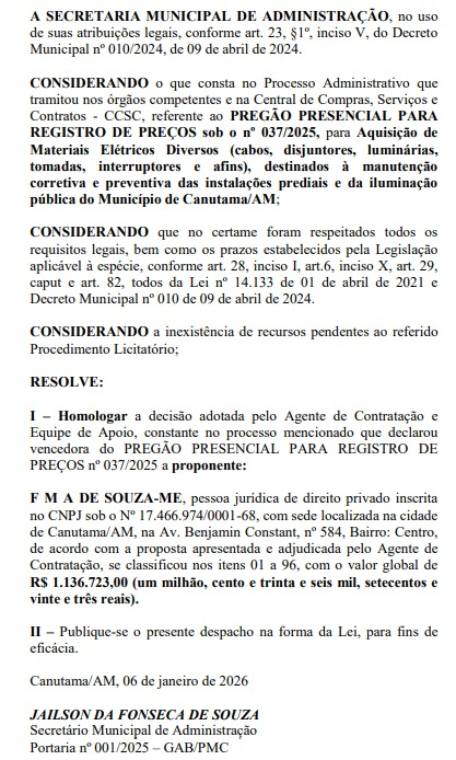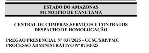 O Pregão Presencial n° 037/2025 foi publicado no Diário Oficial dos Municípios (DOM) e assinado pelo secretário municipal de administração, Jailson da Fonseca de Souza nesta terça-feira (6). Segundo informações do documento oficial, ao todo a Prefeitura de Canutama está adquirindo 96 itens.