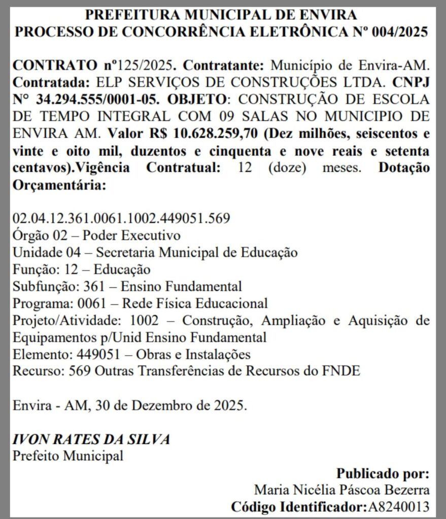 A prefeitura de Envira, sob a gestão do prefeito Ivon Rates (PSD), assinou contrato milionário para construir uma escola de apenas nove salas de aula, ao custo de R$ 10.628.259,70. O valor será pago à empresa ELP Serviços de Construções Ltda., que terá 12 meses para entregar a obra, segundo o documento da Concorrência Eletrônica nº 004/2025, publicado no Diário Oficial dos Municípios (DOM).