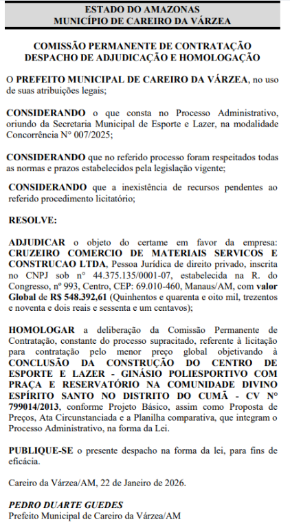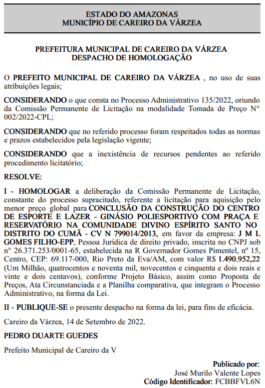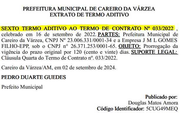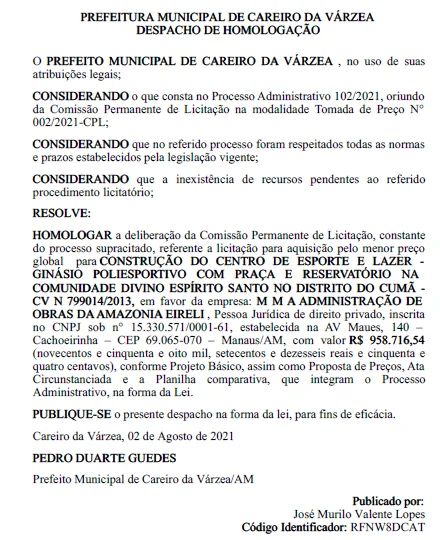 Mesmo tendo cerca de 6 aditivos de prorrogação no primeiro contrato, prorrogados desde 2022. Com a empresa J M L Gomes Filho, localizada na cidade do Rio Preto da Eva. Para prestar os serviços de “conclusão da construção do centro de esporte e lazer Ginásio poliesportivo com praça e reservatório na comunidade Divino Espírito Santo no Distrito do Cumã”.
