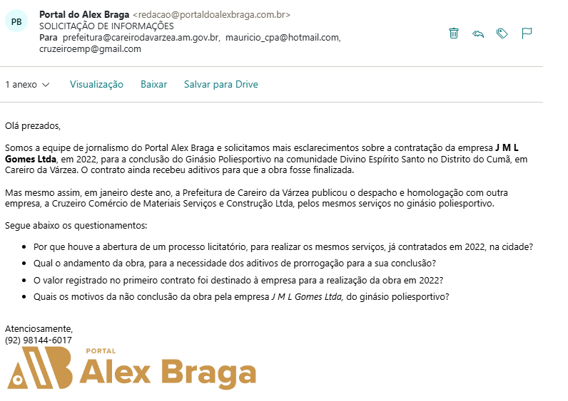 A equipe de Jornalismo do Portal Alex Braga, tentou contato com a Prefeitura de Careiro da Várzea, para pedir mais esclarecimentos sobre os dois contratos pelos mesmos serviços e sobre aditivos de prorrogação feitos desde 2022. Contudo, até o fechamento desta matéria não obtivemos retorno. O espaço segue aberto para mais esclarecimentos.