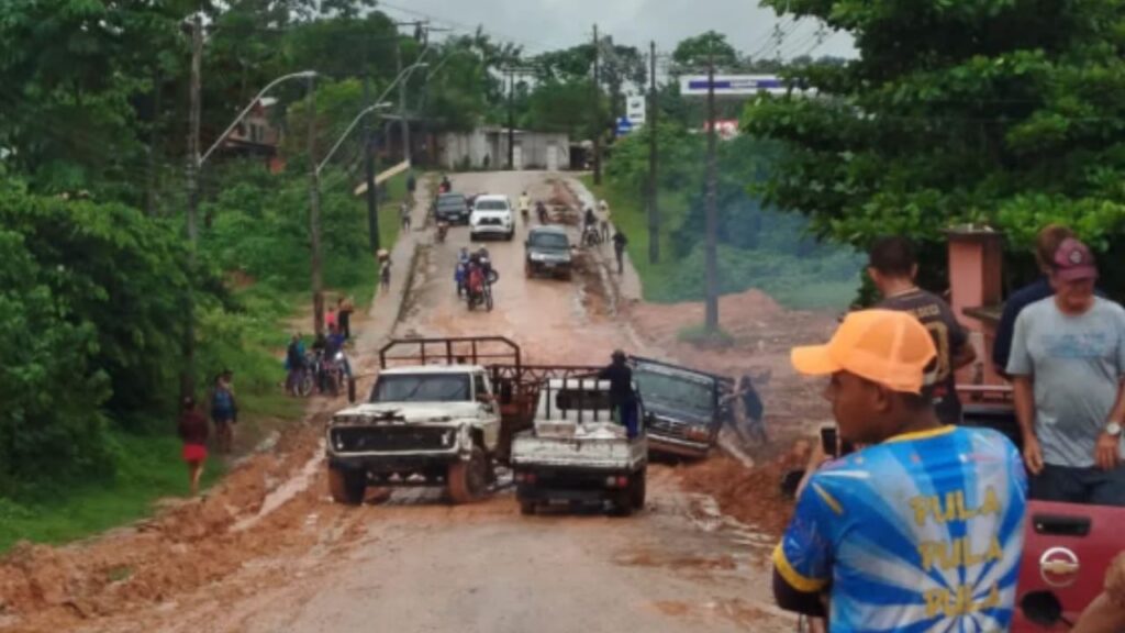 Após fortes chuvas nos últimos dias, a Estrada da Baré tornou-se um verdadeiro atoleiro. Uma imagem publicada nas redes sociais mostram caminhões, carros e motos atolados na lama, enquanto famílias tentam improvisar soluções para atravessar o trecho.
