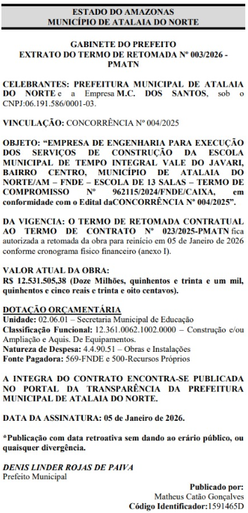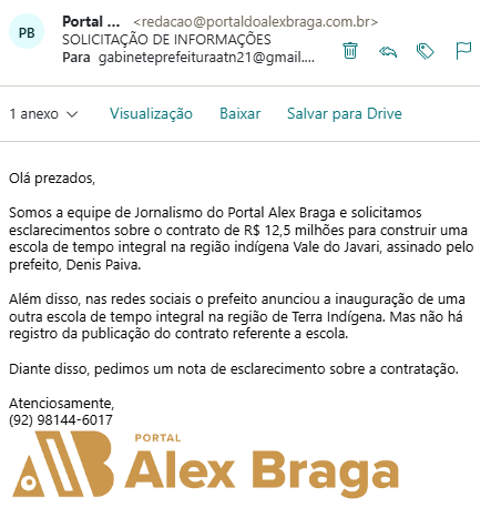 A equipe de Jornalismo do Portal Alex Braga tentou contato com a Prefeitura de Atalaia do Norte, para pedir mais esclarecimentos e detalhes sobre os contratos recentes para construir as duas escolas no região de Terra Indígena Vale do Javari. Contudo, até o fechamento desta matéria não obtivemos retorno. O espaço segue aberto para mais esclarecimentos.