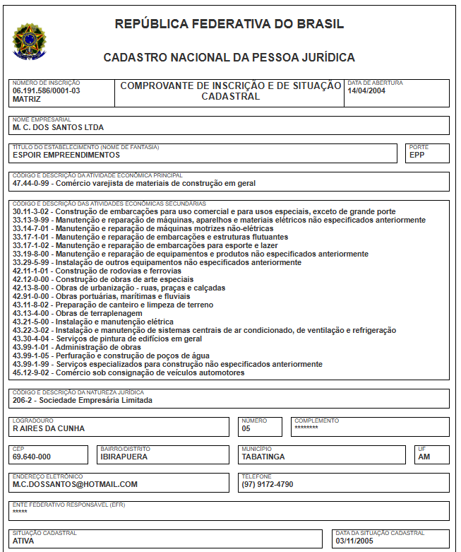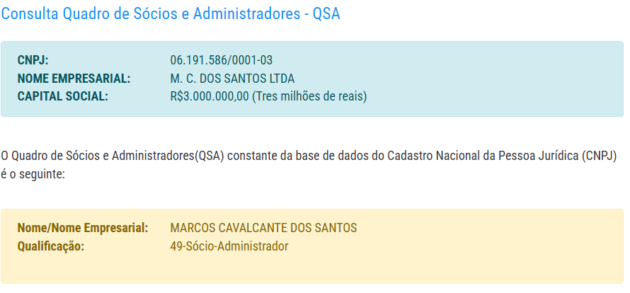 A mesma está classificada como EPP (Empresa de Pequeno Porte), com um capital social de R$ 3 milhões. O empresário responsável pela empresa é identificado, como Marcos Cavalcante dos Santos.
