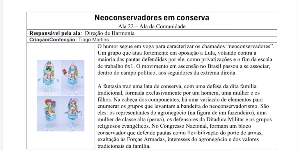 A apresentação da escola de samba Acadêmicos de Niterói, realizada na noite do último domingo (15) na Marquês de Sapucaí, no Rio de Janeiro, provocou repercussão no cenário político após a entrada na avenida da ala batizada de “Neoconservadores em conserva”.