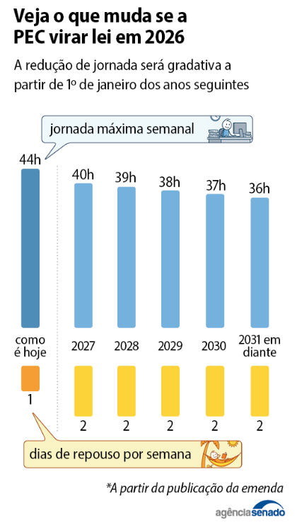 Conforme o gráfico divulgado pela Agência Senado, se a PEC for aprovada e se tornar lei, a escala de trabalho diminuirá ano a após ano. A jornada máxima atual é de 44h, mas deverá a passar a ser 40h em 2027 e com a previsão de 36h até em 2031.