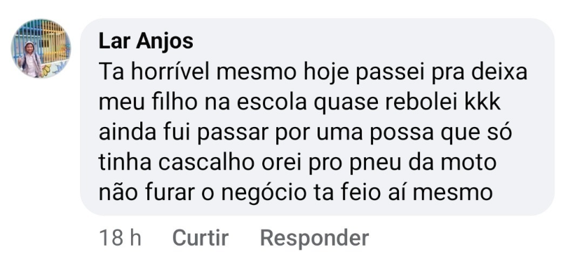 “Tá horrível mesmo. Passei para deixar meu filho na escola e quase caí. Passei por cima da poça e orei para o pneu da moto não furar. O negócio tá feio”, relatou uma internauta.