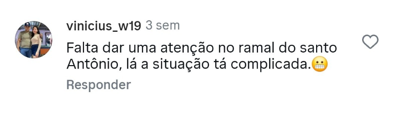 “Falta dar atenção no Ramal Santo Antônio, lá a situação tá complicada”, escreveu um morador.