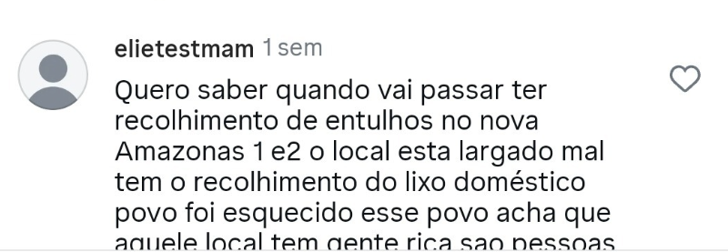 Outro comentário chamou atenção para a ausência de serviços básicos no bairro Nova Amazonas 1 e 2. “Quero saber quando vai passar a ter recolhimento de entulhos. O local está largado, mal tem recolhimento de lixo doméstico. O povo foi esquecido. Esses serviços são essenciais para todos, independentemente de classe social”, desabafou.