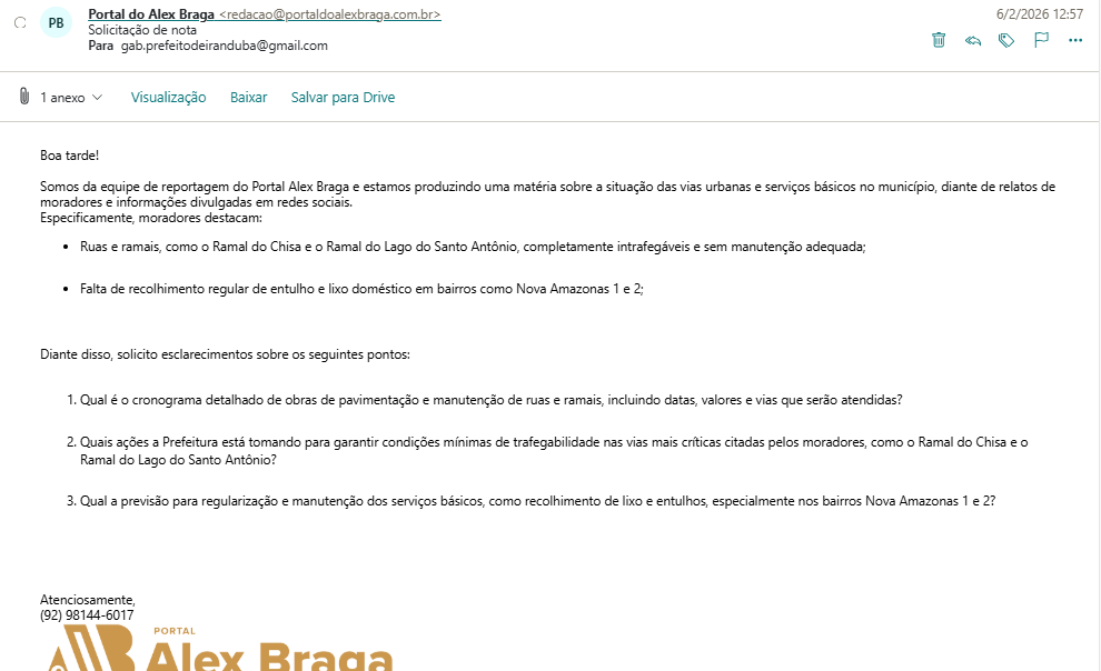 O Núcleo de Reportagem Investigativa do Portal Alex Braga entrou em contato com a prefeitura do município de Iranduba para questionar sobre o assunto, mas até a publicação desta reportagem não obtivemos respostas. O espaço segue aberto para esclarecimentos.