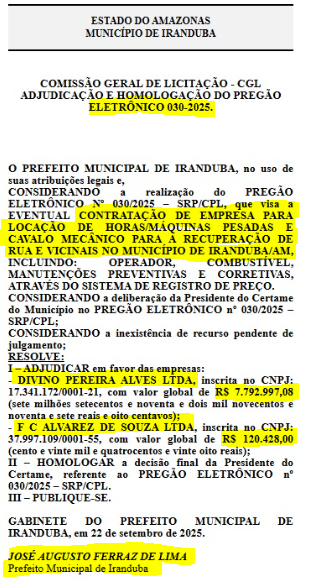 “A Prefeitura de Iranduba avança com obras por todos os cantos. São investimentos que transformam a cidade, fortalecem a infraestrutura e melhoram a qualidade de vida da nossa população. Trabalho sério, compromisso e desenvolvimento chegando a cada bairro. Iranduba segue firme no caminho do progresso. Aqui tem trabalho”, diz a publicação destacada.