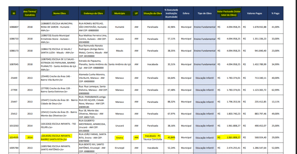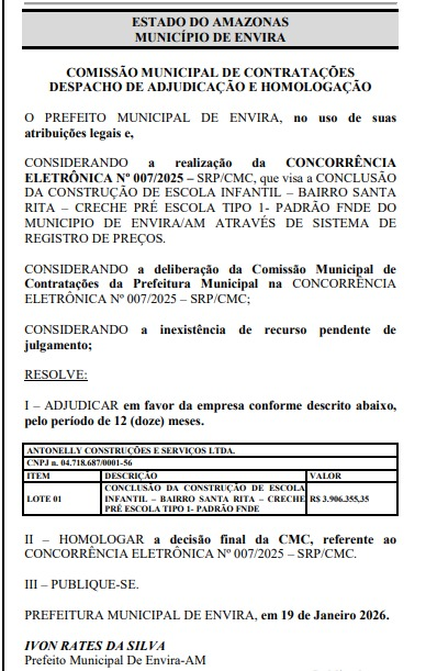 De acordo com a publicação do Diário Oficial dos Municípios (DOM), a empresa Antonelly Construções e Serviços Ltda., vai realizar a conclusão da creche e vai abocanhar dos cofres de Envira o valor global de R$ 3.906.355,35.