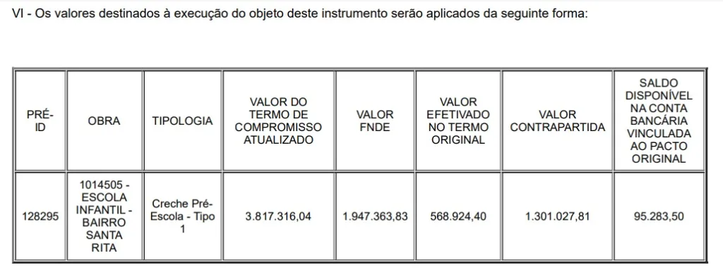 Ao todo, somente para a construção a creche recebeu o montante de R$ 3.909.172,10, sendo efetivado o valor original de mais de R$ 568 mil.