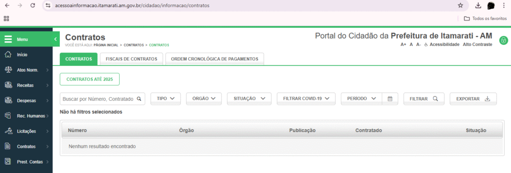 No Portal da Transparência de Itamarati, nenhum contrato foi encontrado pela nossa equipe de reportagem. Confira.
