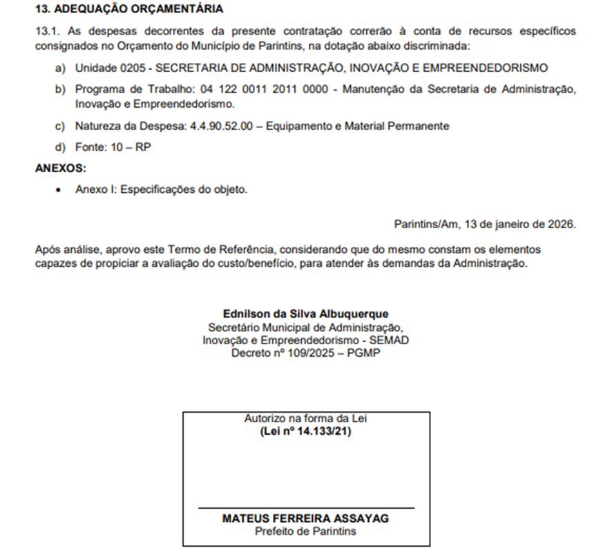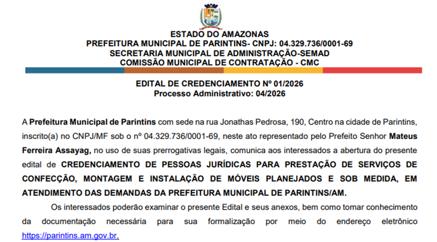 A Prefeitura de Parintins, no interior do Amazonas, publicou um edital que prevê a contratação de serviços de confecção, montagem e instalação de móveis planejados e sob medida, com impacto estimado de R$ 1,7 milhão aos cofres públicos. A medida consta no Edital de Credenciamento nº 01/2026, vinculado ao Processo Administrativo nº 04/2026, e é assinada pelo prefeito Mateus Assayag (PSD).