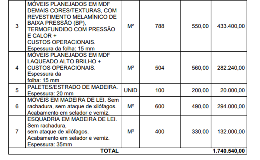 Apesar da ausência de um teto financeiro fechado no edital, o termo de referência indica que a estimativa de gastos ao longo de 12 meses pode se aproximar de R$ 2 milhões. O valor chama atenção por se referir exclusivamente à produção de móveis planejados, custeados com recursos próprios do município.