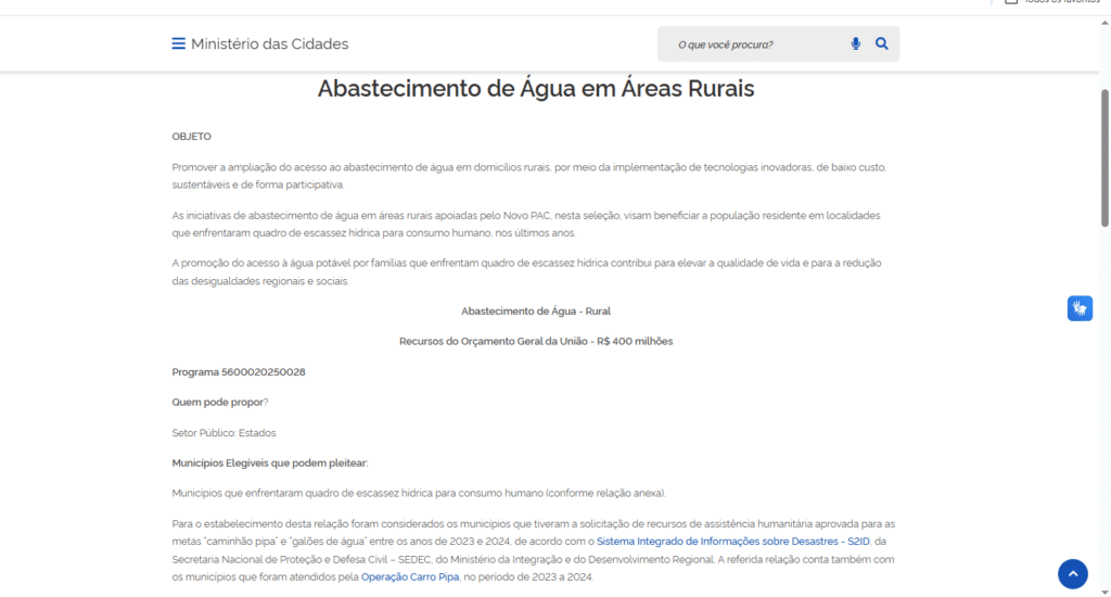 O valor faz parte do eixo “Abastecimento de Água em Áreas Rurais” do Novo PAC, programa que visa levar água potável a famílias que enfrentam escassez hídrica.