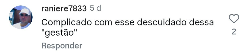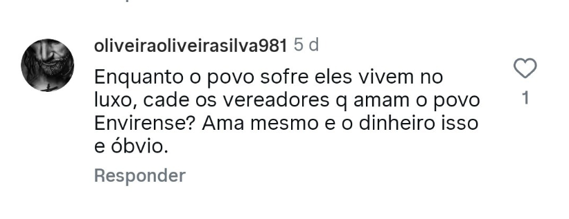 Nas redes sociais, um internauta comentou: “Complicado com esse descuido dessa gestão”; outro disse: “Eu acho uma falta de respeito com a população. Essa gestão é descuidada”; e um terceiro completou: “Enquanto o povo sofre, eles vivem no luxo. Cadê os vereadores que amam o povo envirense? Ama mesmo é o dinheiro, isso é óbvio”.