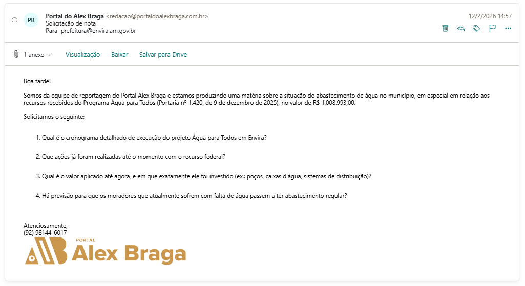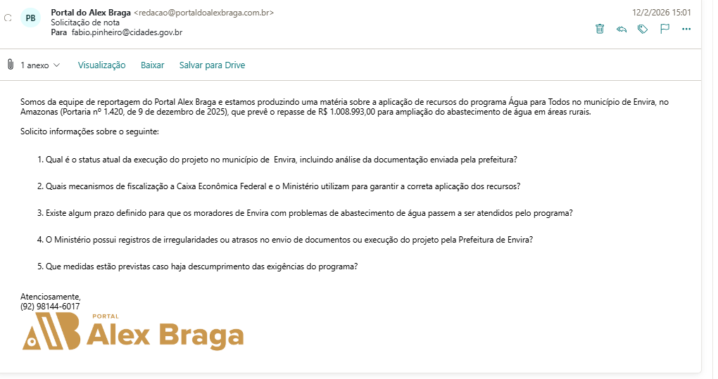 O município de Envira, no interior do Amazonas, recebeu R$ 1.008.993,00 do Programa Água para Todos, mas a população afirma que, sob a gestão do prefeito Ivon Rates (PSD), o recurso não se transformou em água nas torneiras. Enquanto o dinheiro foi garantido por meio da Portaria nº 1.420, publicada pelo Ministério das Cidades em 9 de dezembro de 2025, moradores denunciam que continuam enfrentando escassez e acusam a Prefeitura de descaso com a aplicação dos recursos.