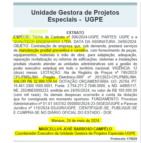 O primeiro contato do governo Wilson Lima com a empresa Qualitech Engenharia, ocorreu em maio de 2024, quando a Unidade Gestora (UGPE) firmou o contrato n° 006/2024 para: manutenção predial preventiva e corretiva, com fornecimento de peças, equipamentos, materiais e mão de obra, para adaptação, adequação, reparação revitalização ou reforma de edificações, sistemas e instalações prediais visando atender as unidades administrativa. Na época, o valor do contrato foi de R$ 32.999.339,54 (Trinta e dois milhões, novecentos e noventa e nove mil, trezentos e trinta e nove reais e cinquenta e quatro centavos).