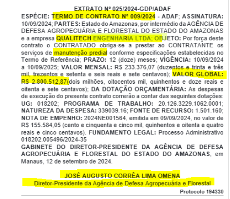 No mesmo ano a Agência de Defesa Agropecuária e Floresta (ADAF), firmou o contrato n° 009/2024 com a empresa do Maranhão, também para manutenção predial pelo valor global de R$ 2.800.512,87 (Dois milhões, oitocentos mil, quinhentos e doze reais e oitenta e sete centavos).