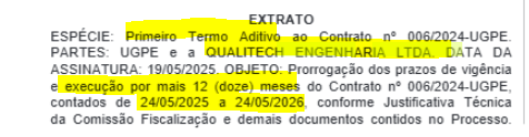 Em maio do ano passado, a UGPE formalizou o 1° Termo Aditivo com a empresa do prefeito investigado. O aditivo foi firmado por mais de 12 meses e encerra em maio deste ano.