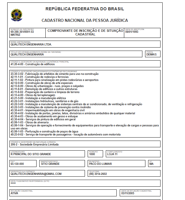 A empresa com a razão social Qualitech Engenharia Ltda., tem o nome fantasia Qualitech Engenharia, opera com o CNPJ 69.388.361/0001-53 e foi fundada em 1993. O endereço de sua sede está localizada na Rua Principal do Sitio Grande, 1000, Paco do Lumiar – MA, 65.130-000. Sua atividade principal é de Construção de edifícios.
