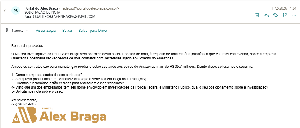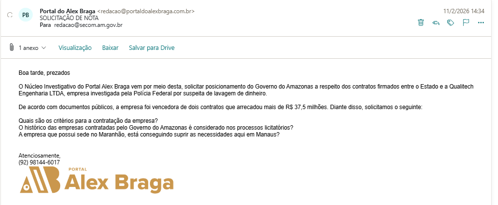 O Núcleo Investigativo do Portal Alex Braga (PAB), encaminhou um pedido de nota tanto para o Governo do Amazonas, quanto para a empresa citada. Até o fechamento da reportagem, nenhum retorno nos foi dado. O espaço continua aberto.