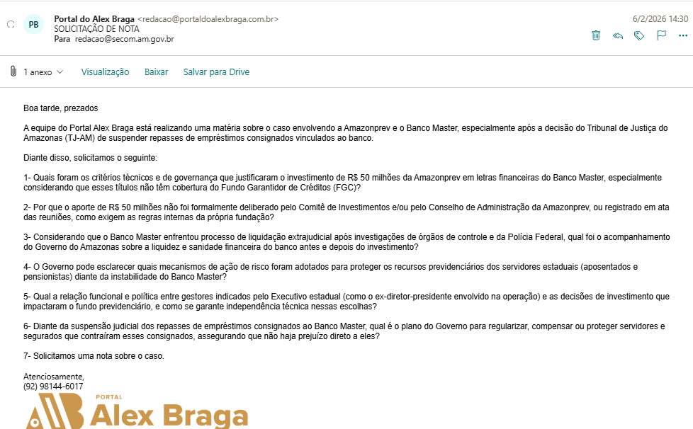 Leia mais: Sem ata e sem explicação, Amazonprev aplica R$ 50 milhões antes do Banco Master ser liquidado