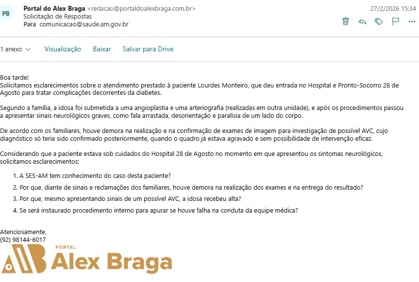 O Núcleo de Reportagem Investigativa do Portal Alex Braga entrou em contato com a Secretaria de Estado de Saúde do Amazonas (SES-AM), mas até a publicação desta matéria não obtivemos respostas. O espaço segue aberto para esclarecimentos.