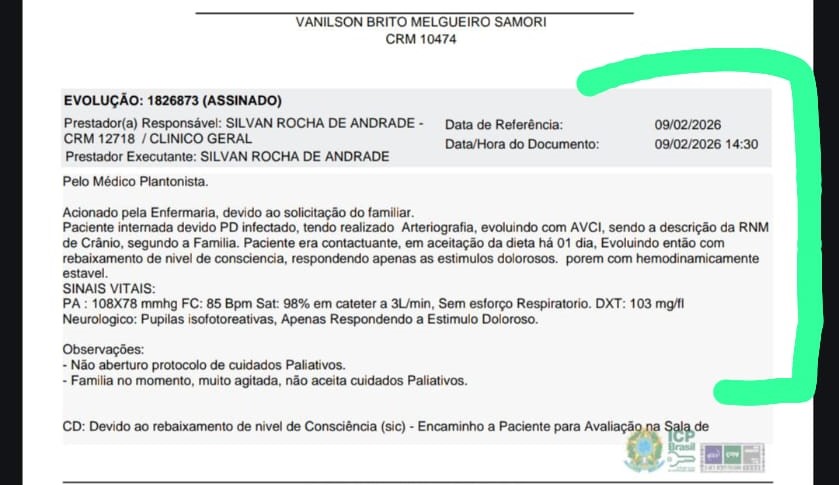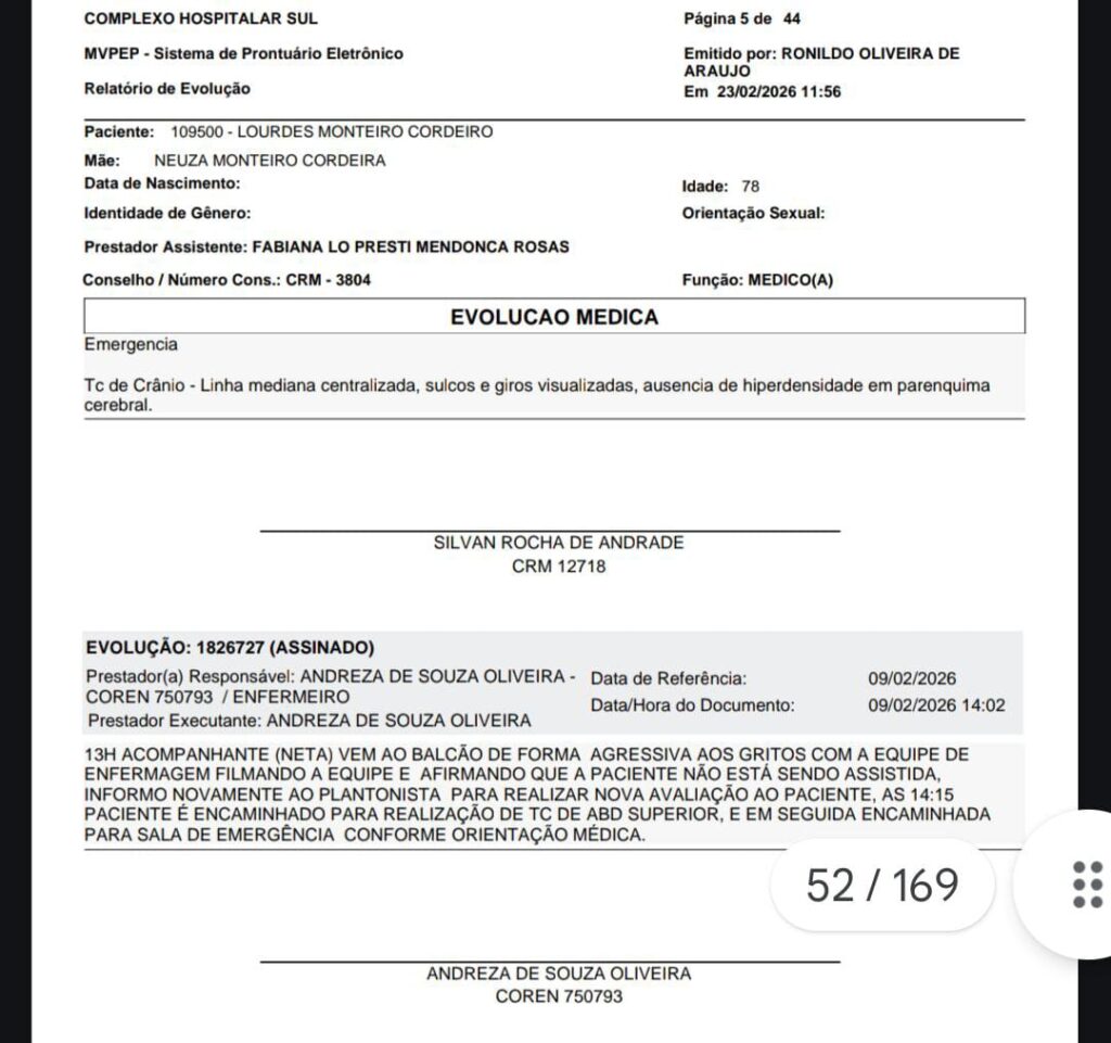 No prontuário médico, a equipe de enfermagem também registrou que, às 13h do dia 9 de fevereiro, Geovana, teria se dirigido ao balcão “de forma agressiva”, aos gritos, afirmando que Lourdes não estava sendo assistida. O documento informa ainda que, após o episódio, o plantonista foi comunicado para reavaliar a paciente e que, às 14h15, ela foi encaminhada para realização de tomografia e, posteriormente, direcionada à sala de emergência.