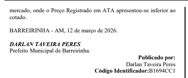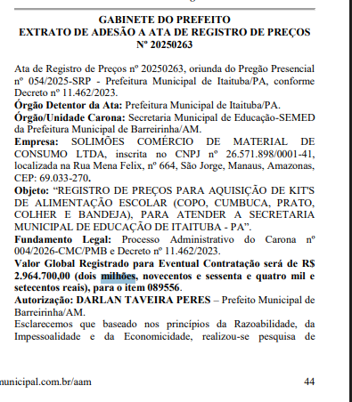 O prefeito Darlan Taveira Peres (União Brasil), do município de Barreirinha, vai desembolsar R$ 2.964.700,00 (dois milhões, novecentos e sessenta e quatro mil e setecentos reais) para a compra de kits de alimentação escolar, compostos por copo, cumbuca, prato, colher e bandeja, sem que a Prefeitura informe quais escolas receberão os itens ou apresente detalhes sobre a quantidade e especificações do material.