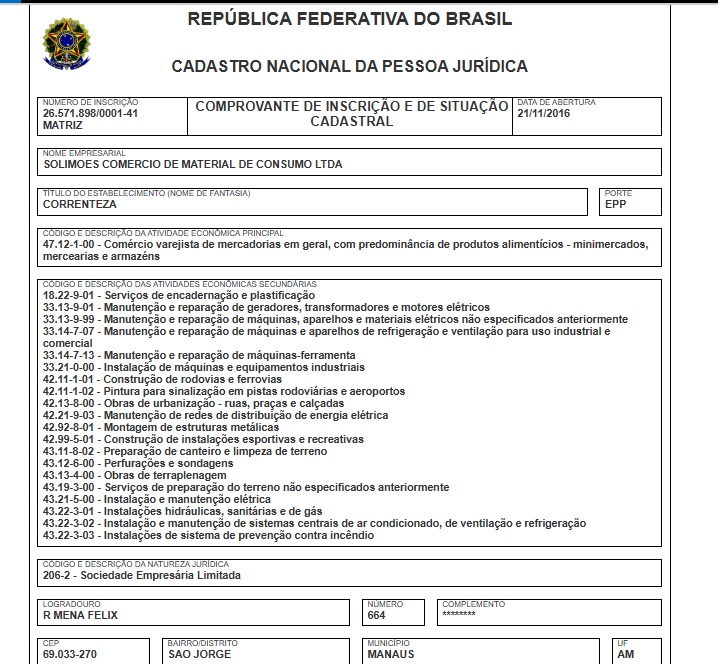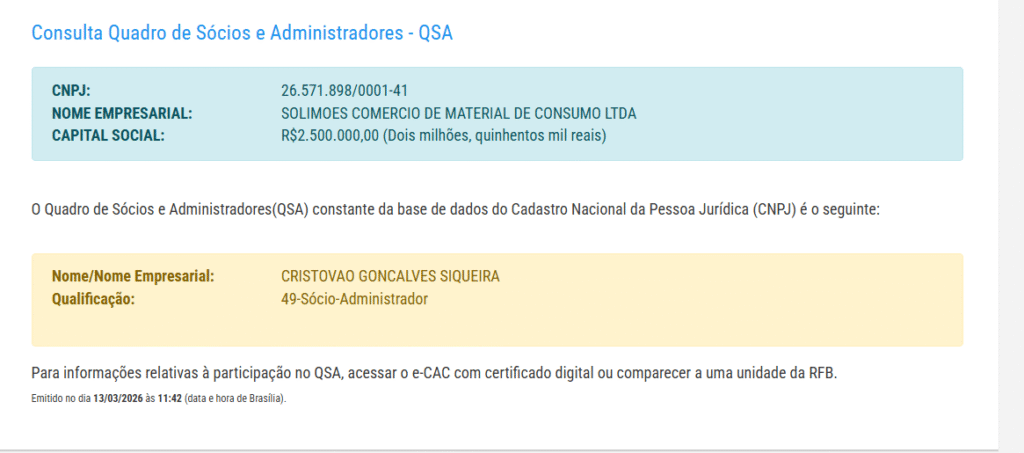 A empresa responsável pelos kits é a SOLIMÕES COMÉRCIO DE MATERIAL DE CONSUMO LTDA, localizada na Rua Mena Felix, nº 664, São Jorge, Manaus, AM, CEP 69.033-270. A empresa tem como atividade principal o comércio varejista de mercadorias em geral, com predominância de produtos alimentícios – minimercados, mercearias e armazéns. Seu capital social é de R$2.500.000,00 (Dois milhões, quinhentos mil reais) e tem como sócio – administrador Cristóvão Gonçalves Siqueira.