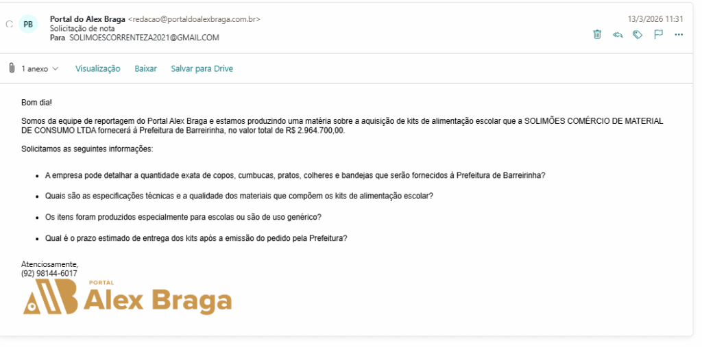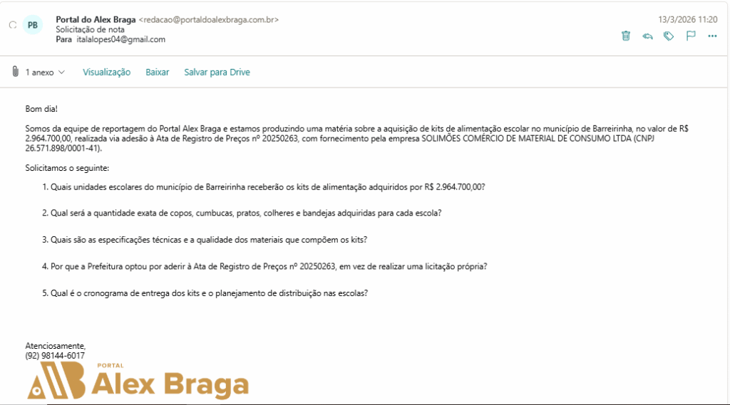 O Núcleo de Reportagem Investigativa do Portal Alex Braga entrou em contato com a prefeitura de Barreirinha para falar sobre o contrato, mas até a publicação desta matéria não obtivemos respostas. O espaço segue aberto para esclarecimentos.