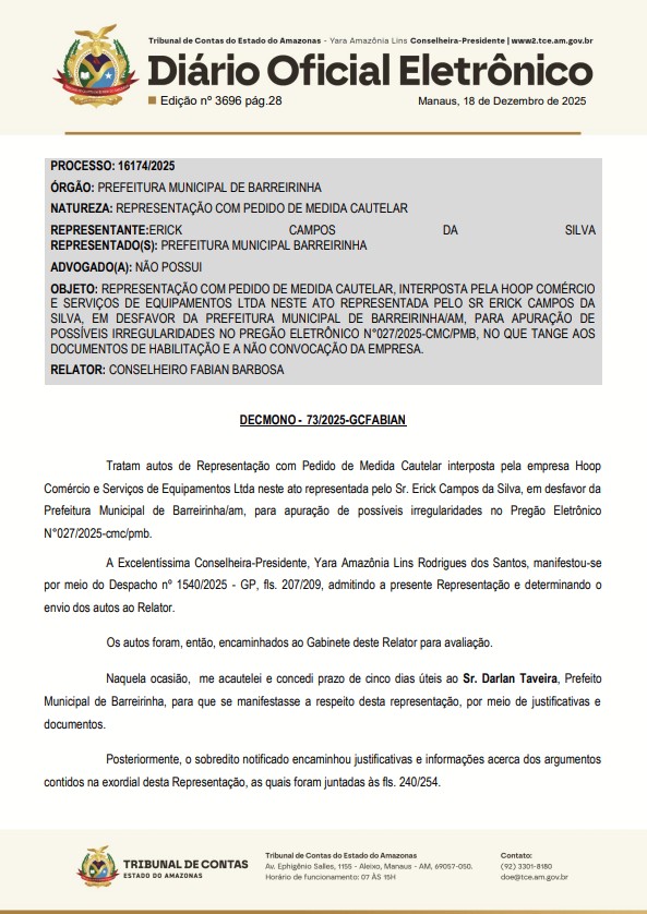 Darlan Taveira não é novato em polêmicas envolvendo compras públicas. Em dezembro de 2025, o Tribunal de Contas do Estado do Amazonas (TCE-AM) suspendeu uma licitação da Prefeitura para manutenção de embarcações de saúde, apontando exigência ilegal de documentos fiscais antecipados, que restringia a competitividade.