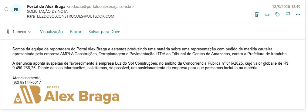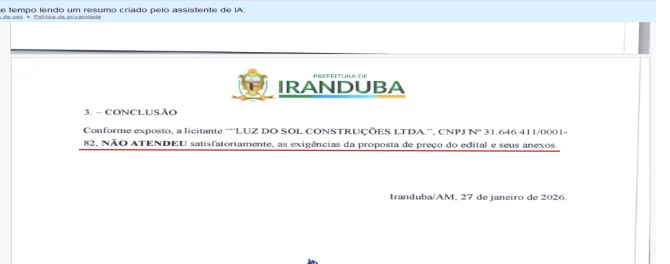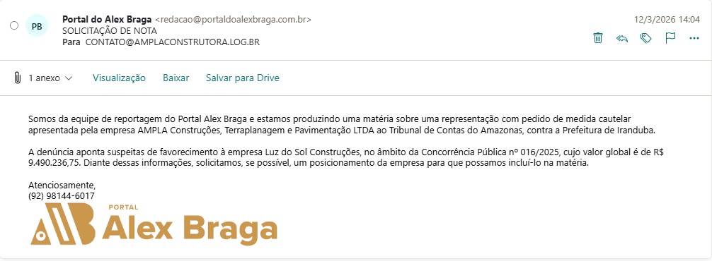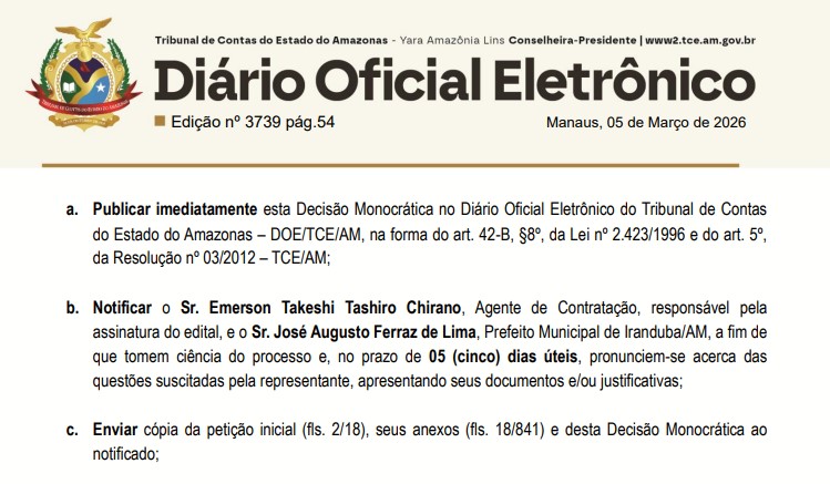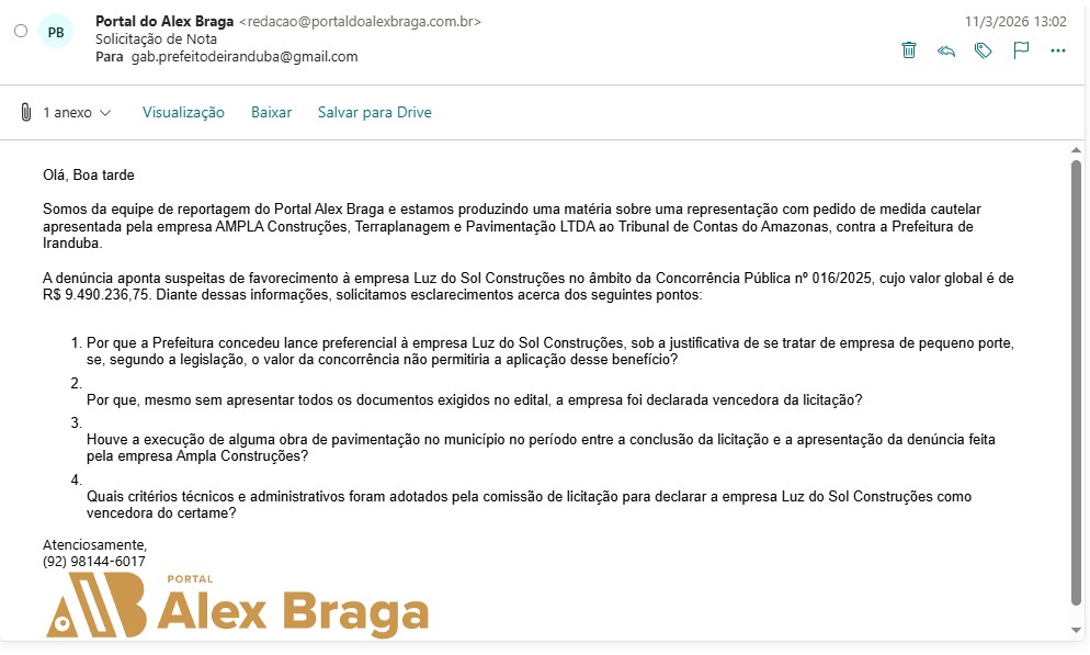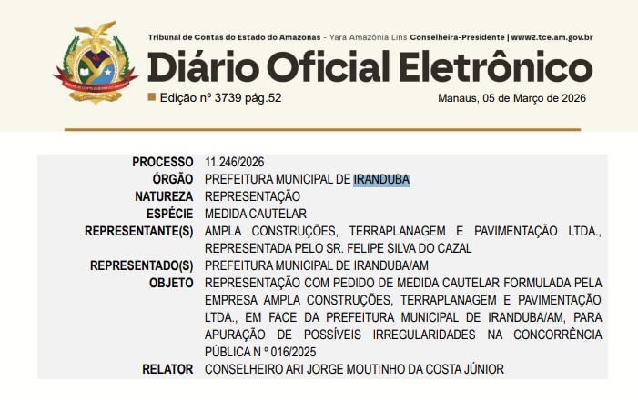 O Tribunal de Contas do Amazonas (TCE-AM) recebeu uma denúncia da empresa AMPLA CONSTRUÇÕES, TERRAPLANAGEM E PAVIMENTAÇÃO LTDA, contra a prefeitura de Iranduba, administrada pelo prefeito Augusto Ferraz (UB), para apurar possíveis irregularidades na Concorrência Pública Nº 016/2025, no valor de R$ 9,4 milhões. Representada por Felipe Silva do Cazal, a empresa afirma que a prefeitura favoreceu a empresa LUZ DO SOL CONSTRUÇÕES LTDA, durante todo o processo de licitação.