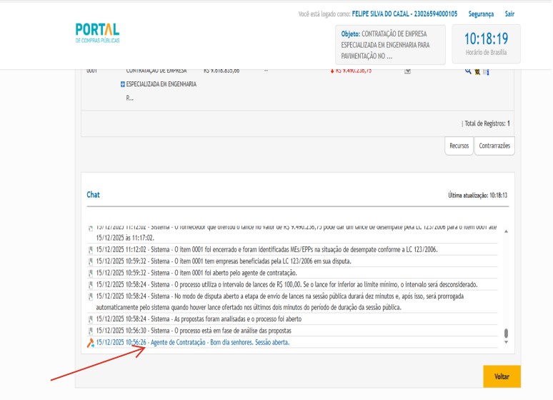 A sessão foi suspensa para análise de documentos da primeira colocada e reaberta algumas vezes para ser suspensa novamente no dia 2 de janeiro de 2026, para a fase de desempate. Segundo a denunciante, durante todo o processo, o agente contratante teria tomado decisões que beneficiaram a empresa LUZ DO SOL CONSTRUÇÕES LTDA.