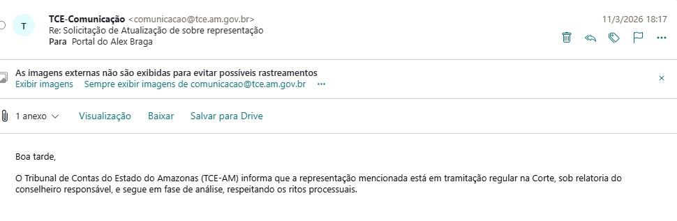 O Núcleo de Reportagem Investigativa do Portal Alex Braga entrou em contato com o Tribunal de Contas do Amazonas para saber se houve atualizações referente a representação interposta. Eles informaram que a representação está em tramitação e segue em análise.