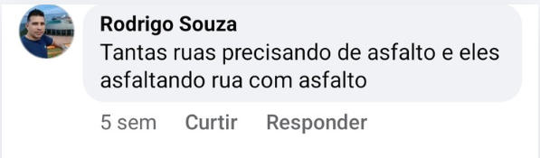 Outro completou: “Prefeito, tantas ruas de tantos bairros da cidade precisando de asfalto e o senhor vem asfaltar a rua que não precisava. Que palhaçada é essa? Que falta de respeito é essa com a população?”