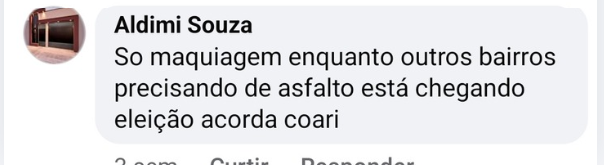 Enquanto a Rua Padre Rafael recebe atenção, bairros como Renascer, Monte Sinai, Urucu e Iaci Dantas continuam atolados na lama. Moradores reclamam que ruas realmente necessitadas de pavimentação estão abandonadas. “Era pra eles colocar aqui no Beco Santos Dumont que está precisando mesmo”, afirmou outro morador. “Só maquiagem enquanto outros bairros precisam de asfalto. Está chegando eleição, acorda Coari!”