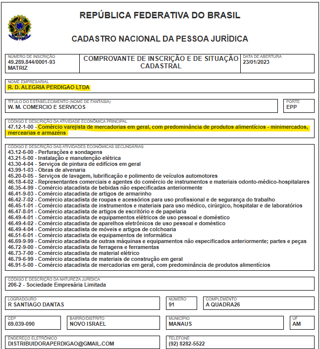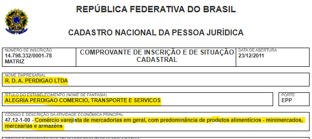 1 – R. D. Alegria Perdigão Ltda – EPP, inscrita sob o CNPJ nº 49.289.844/0001-93 – (Comércio de alimentos);