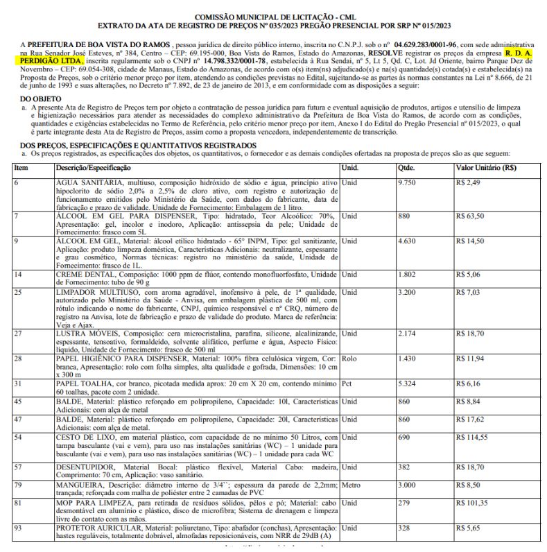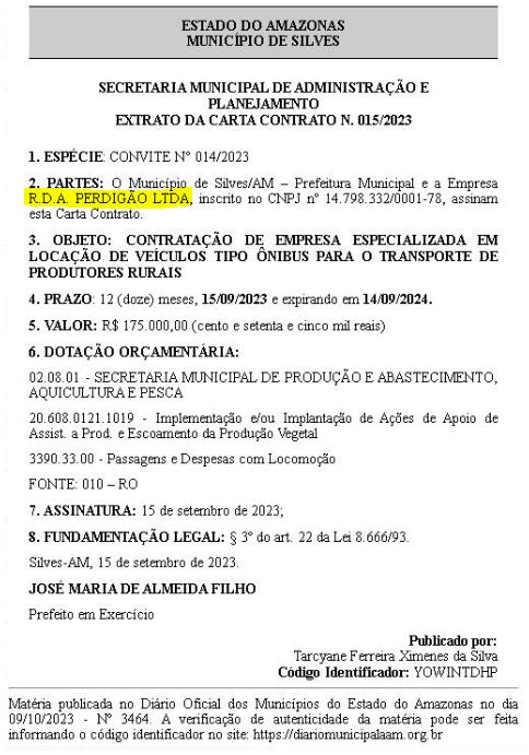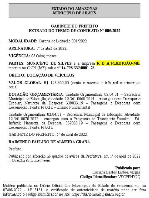 A empresa R.D.A. Perdigão tem contratos com outras prefeituras, incluindo com a Prefeitura de Silves, para os serviços de locação de veículos, ônibus para produtores rurais. Já para a Prefeitura de Boa Vista do Ramos, os serviços prestados incluíram merenda escolar, materiais de limpeza e a locação de transporte escolar.