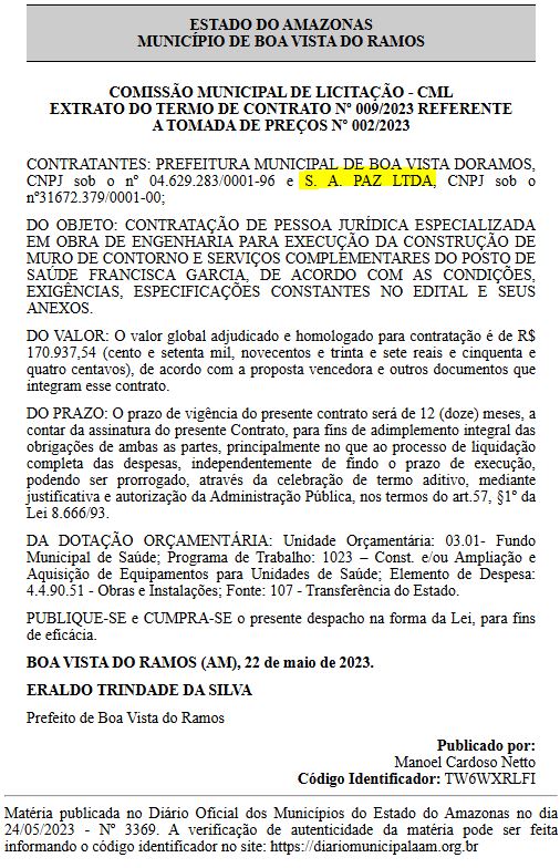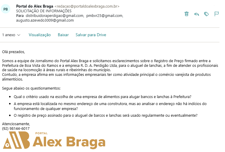 A equipe de Jornalismo do Portal Alex Braga, tentou contato com a Prefeitura de Boa Vista do Ramos e com os empresários envolvidos nos contratos, para pedir mais esclarecimentos sobre os contratos realizados. Contudo, até o fechamento desta matéria, não obtivemos resposta. O espaço segue aberto para mais esclarecimentos.