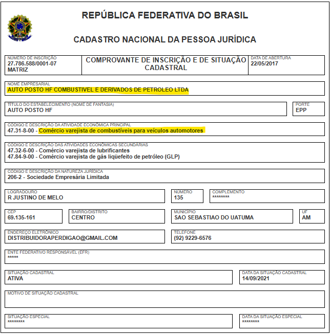 2 – Auto Posto HF, inscrita sob o CNPJ nº 27.786.588/0001-07 – (Comércio varejista de combustíveis);