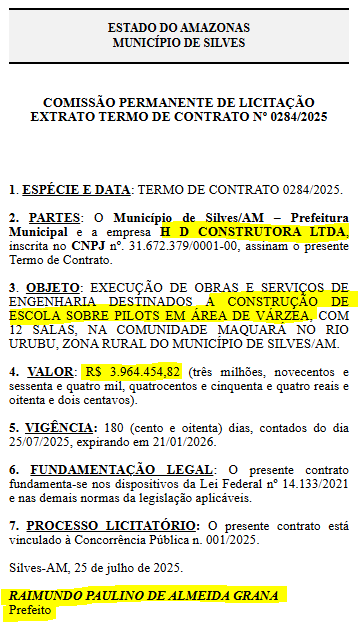 Em um contrato recente com a Prefeitura de Silves, a empresa da mãe do empresário, recebeu o valor de quase R$ 4 milhões para a construção de uma escola de pilots, com 12 salas, na comunidade de Maquará no Rio Urubu, zona rural do município de Silves.
