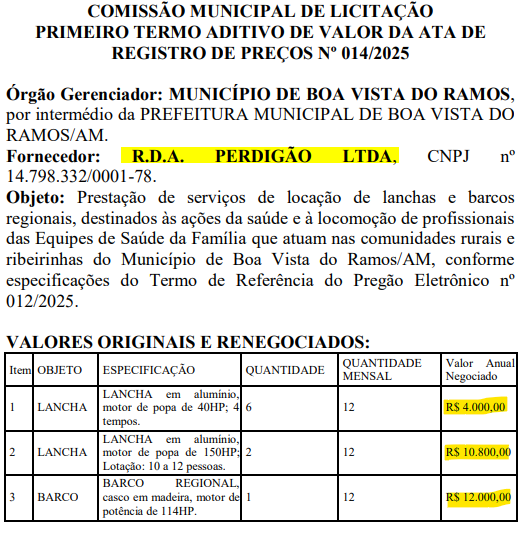 O contrato mais recente firmado entre o prefeito e os empresários Raimundo Deiveson Alegria Perdigão e a mãe dele, Silvete Alegria Paz, é um acordo para aluguel de barcos e lanchas. A primeira questão, é que a empresa diz fornecer alimentos, mas será a responsável pelo transporte de agentes de saúde às áreas rurais e ribeirinhas do município.