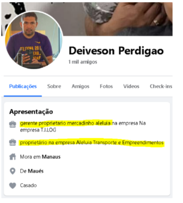 Mesmo a mãe do empresário apresentando em suas redes sociais ser proprietária da empresa, ela, porém, aparece com a farda da empresa do filho, a saber, a R.D.A. Perdigão Ltda.