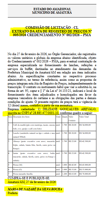 No documento publicado no Diário Oficial dos Municípios (DOM), a prefeita Nazaré Rocha homologou a Ata de Registro de Preço n° 005/2026 em favor da empresa DILZIANE GONCALVES AREVALO, inscrita no CNPJ nº 28.885.477/0001-10, para fornecer: x-salada, pizza, suco, batata frita, pão com manteiga, sanduiche natural e outros.