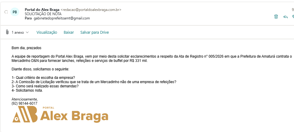 Somando todos os itens previstos na ata, o valor estimado ultrapassa R$ 330 mil, caso todo o quantitativo registrado venha a ser efetivamente contratado ao longo da vigência. Ainda, fica o questionamento, um mercadinho fornecendo lanches e comida? O povo de Amaturá quer saber.