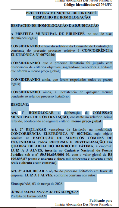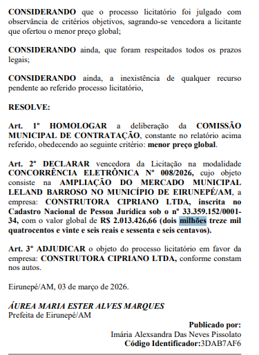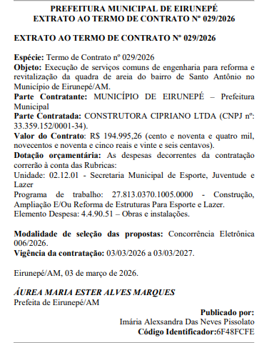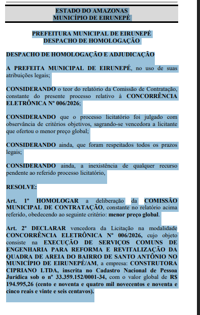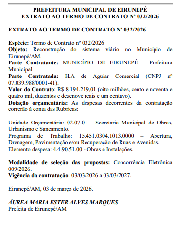 Em meio ao estado de emergência provocado pela cheia do Rio Juruá, a prefeita Áurea Marques autorizou R$ 10.598.534,80 em obras públicas no município de Eirunepé. Os contratos, que incluem reformas de quadras, ampliação do mercado municipal e reconstrução do sistema viário, foram publicados no Diário Oficial dos Municípios enquanto a cidade enfrenta alagamentos e dificuldades de mobilidade causadas pela subida do rio.